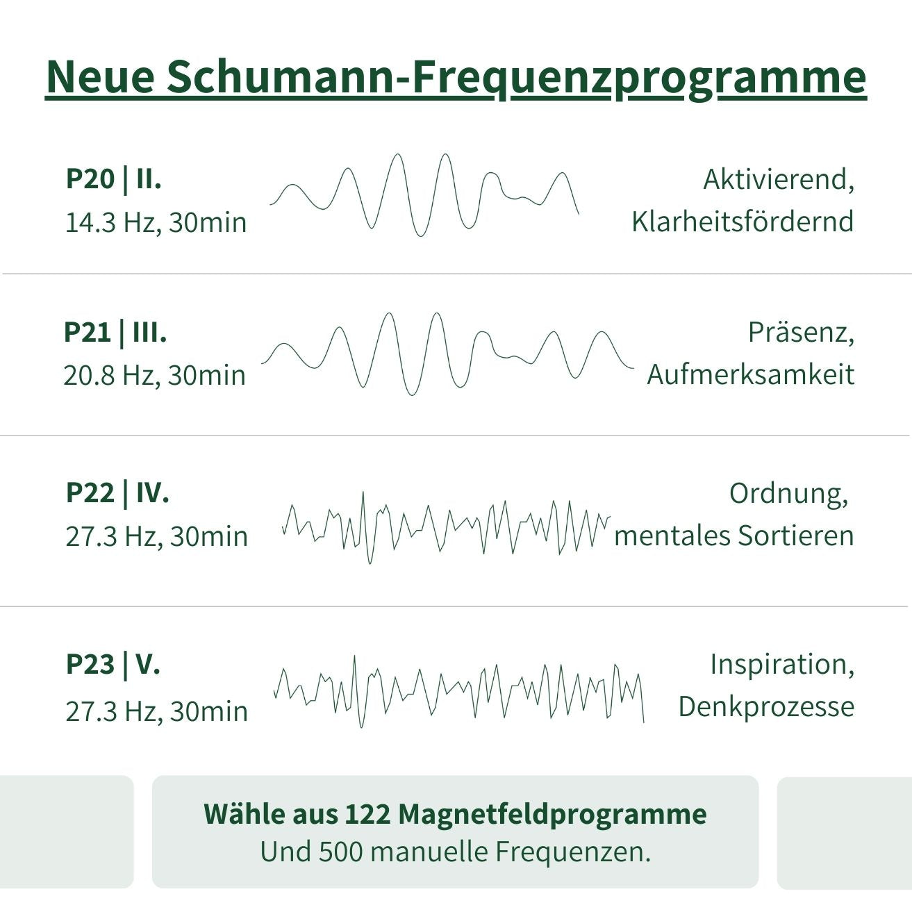 Unser smartes Steuergerät bietet 122 optimierte Programme & 500 manuelle Frequenzen zur individuellen Anwendung – von tiefer Entspannung bis gezielter Energieaktivierung.
